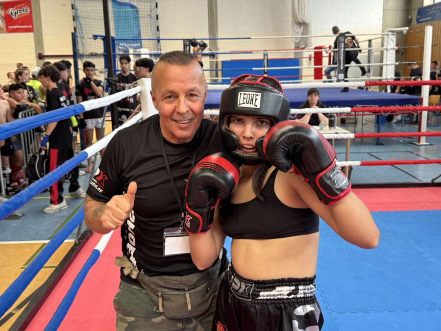 Leonie und Lou kämpfen in der Bambini klasse - 25 kg Leonie gewinnt ihren Kampf und wird somit neue deutsche Meisterin . Lou verliert ihren Kampf knapp nach Punkten und wird Vize deutsche Meisterin .